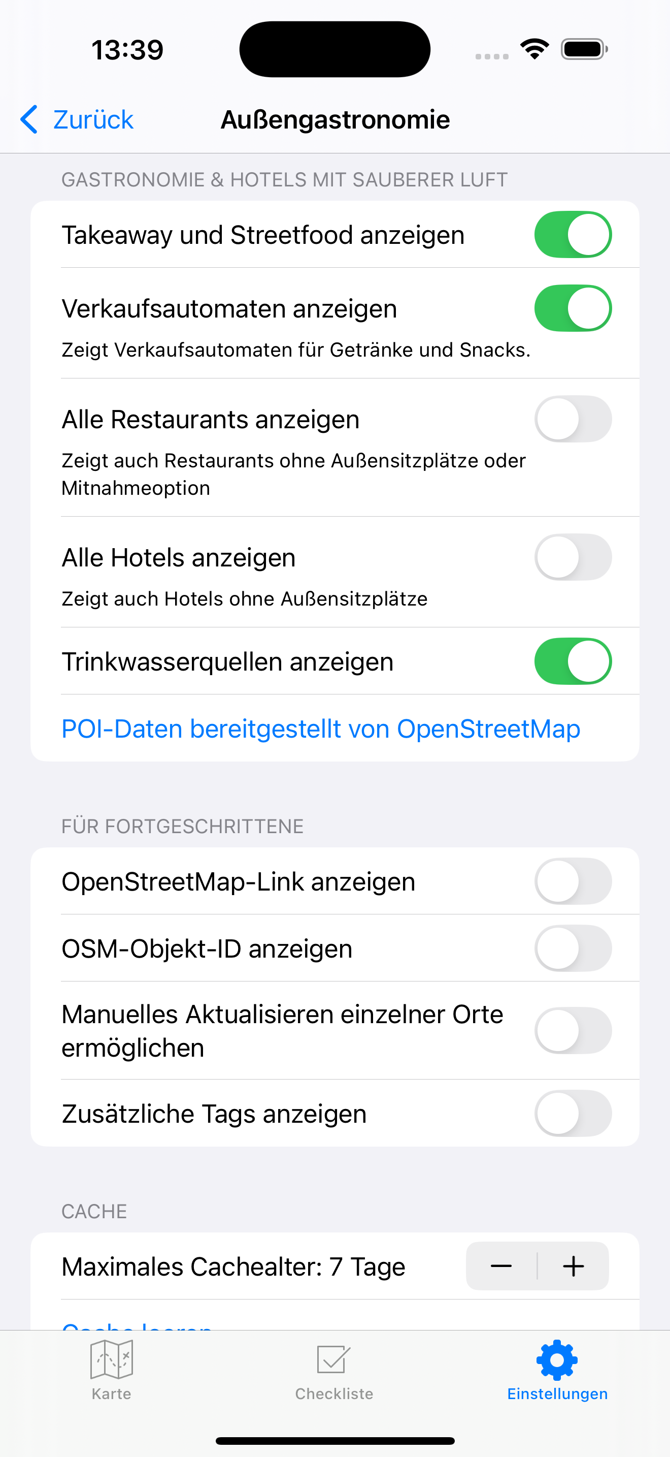 Es kann eingestellt werden, dass Restaurants und Hotels auch angezeigt werden, wenn unbekannt ist, ob Außensitzplätze vorhanden sind.