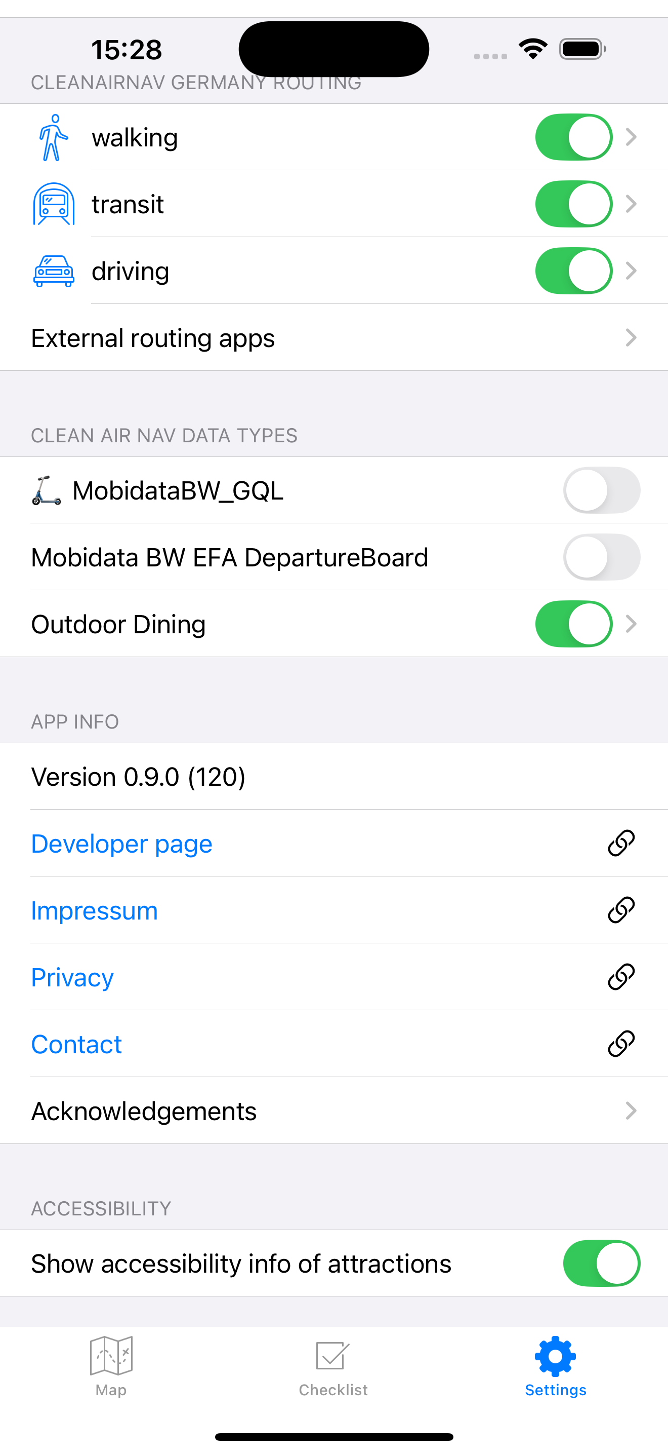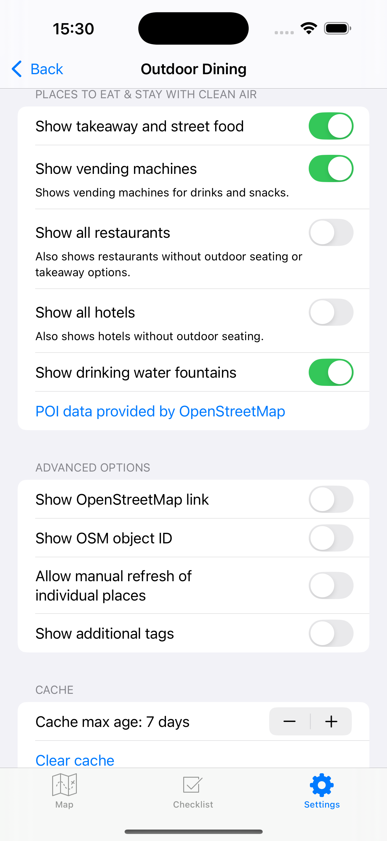 To support this, the app displays all restaurants and hotels on the map — shown in gray if no outdoor seating data is available.