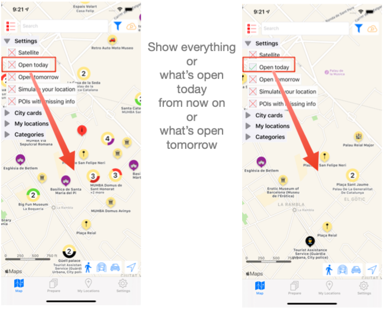 Using the Barcelona Attractions Map, you can say: only show what's open today from now on or what's open tomorrow or both together: