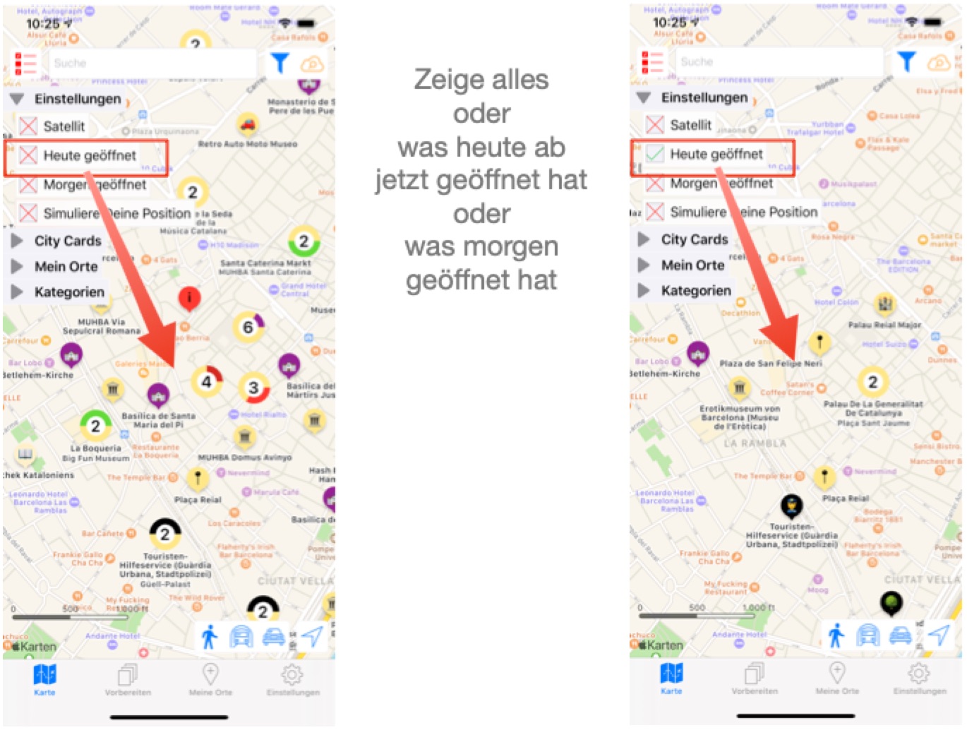 Mit der Barcelona Attractions Map kannst du sagen: zeige auf der Karte nur an, was heut ab jetzt geöffnet hat. Oder zeig nur an, was morgen geöffnet hat. Oder zeige beides zusammen an: